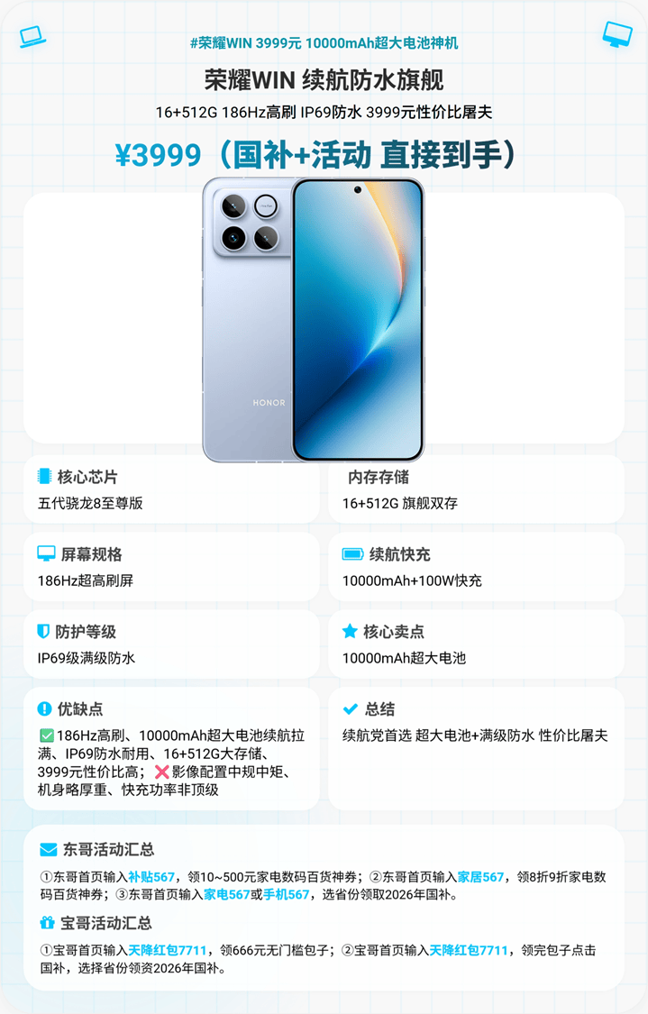 4000元档续航与防护首选,3999元16+512G存储,搭载第五代骁龙8至尊版芯片,16G LPDDR5X+512G UFS 4.1性能铁三角,内置超小体积散热风扇,日常、游戏流畅,控温稳定。核心亮点是10000mAh星海湖巨无霸电池,重度使用能支撑两天半一充,100W有线分钟满电,彻底告别电量焦虑;IP69级防尘防水,高压冲洗、高温水流冲击均能从容应对。