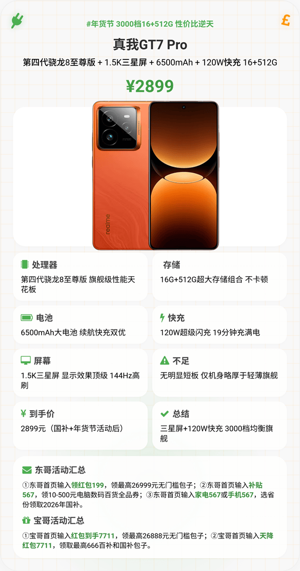3000元档续航天花板,2899元16+512G存储,搭载第四代骁龙8至尊版芯片,16G LPDDR5X Ultra+512G UFS 4.1性能铁三角,安兔兔跑分出色,东风涡轮散热保障长时间游戏控温稳定。核心亮点是10000mAh青海湖巨无霸电池,重度使用能支撑两天一充,100W有线分钟满电,彻底告别电量焦虑。